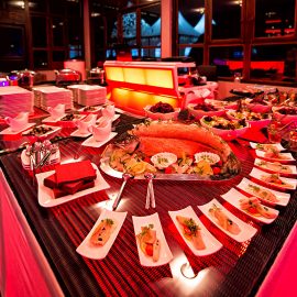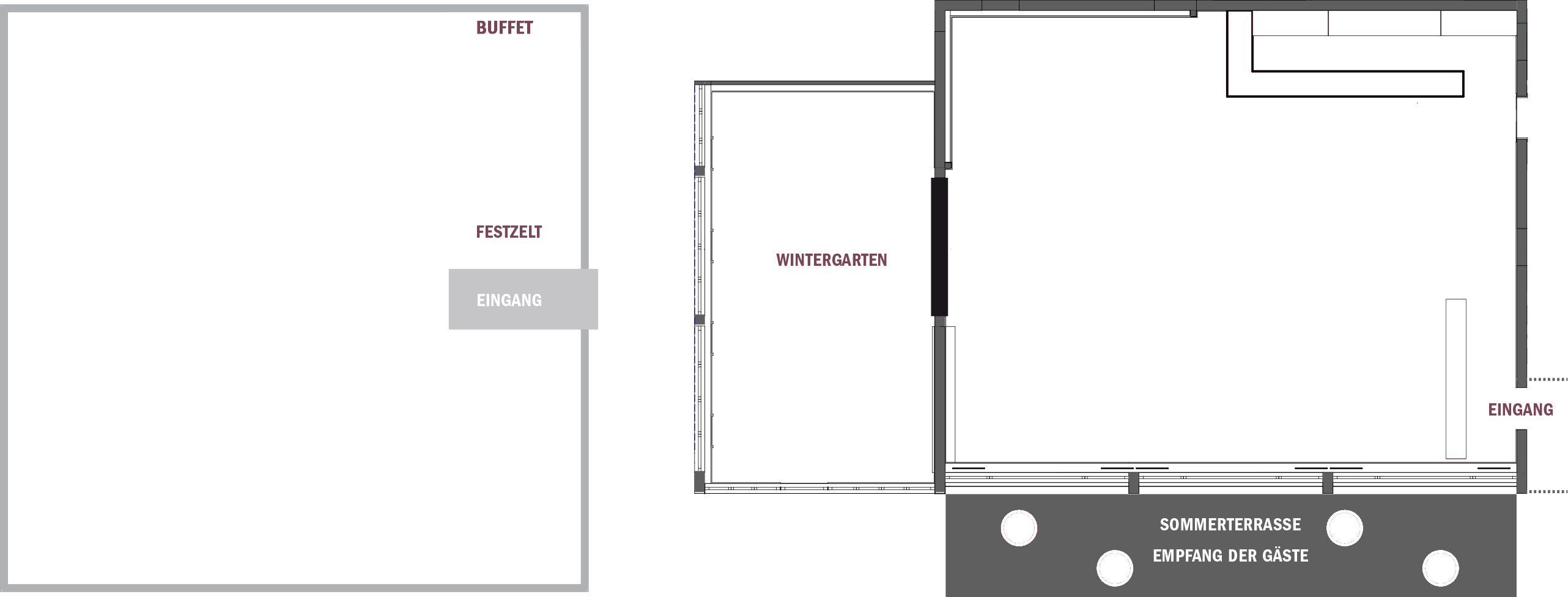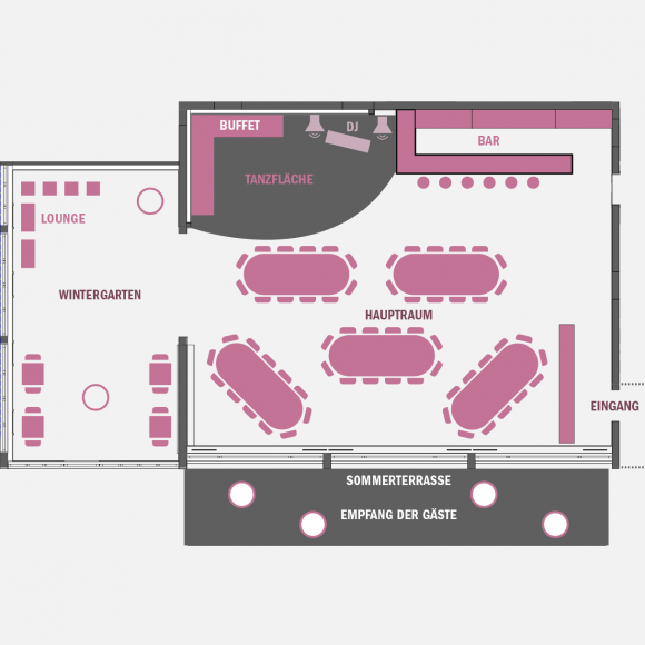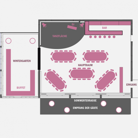 Empfang auf der Terrasse • Essen und Tanzen im Hauptraum • Buffet im Wintergarten