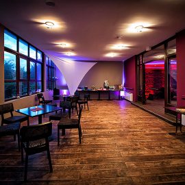 Empfang und Essen auf der Terrasse • Tanzen im Hauptraum • Loungearea im Wintergarten